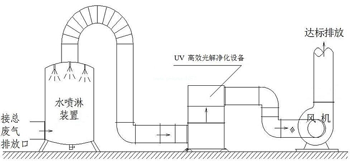 廢氣源→高效吸收塔(吸收掉漆霧、粉塵以及顆粒物為活性炭和光催化提供優(yōu)良的運行環(huán)境)→活性炭吸附塔(吸附部分苯甲苯二甲苯)→光催化設(shè)備(紫外線照射空氣產(chǎn)生臭氧氧化廢氣分子利于達標(biāo)排放)→高壓風(fēng)機(高壓的吸力作用下持續(xù)將廢氣抽出車間)→煙囪高空排放(也可低空排放)。