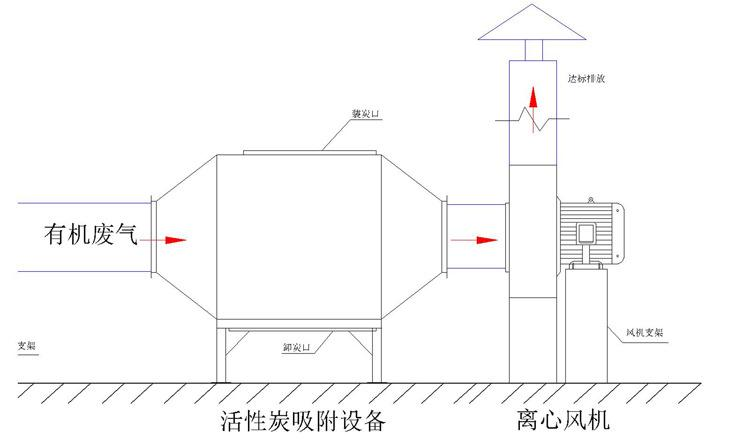 廢氣經(jīng)過吸附塔內(nèi)的初效過濾器除去固體顆粒物后,進(jìn)入塔體,經(jīng)過活性炭層吸附后,除去氣體中的有機(jī)廢氣分子,達(dá)到符合排放標(biāo)準(zhǔn)的凈化氣體,經(jīng)風(fēng)機(jī)排到室外。